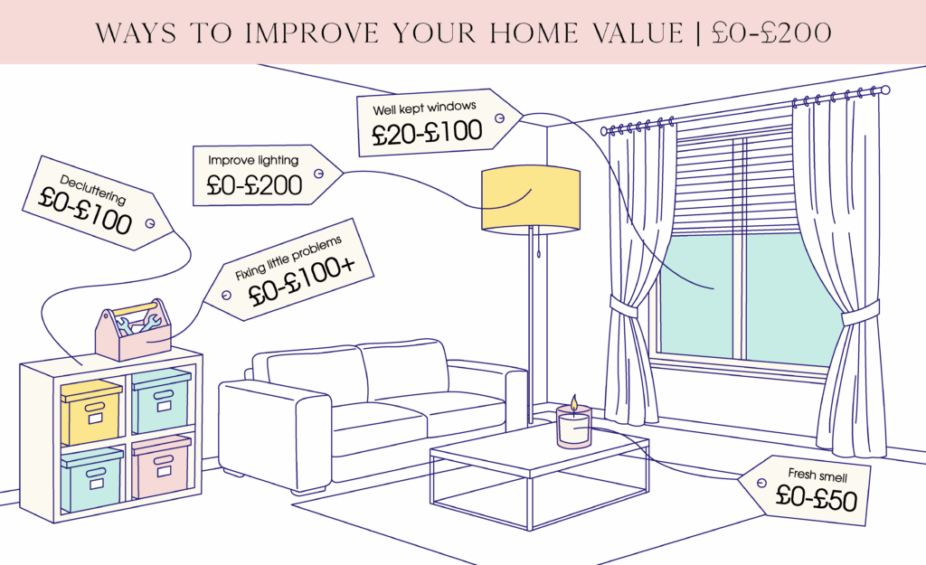 Fix, clean and enhance your space by identifying any maintenance and repair issues like loose door hinges or a leaky tap, which can cost you anywhere from £0 to £100+. What may seem trivial to a homeowner could be a deal-breaker for buyers.