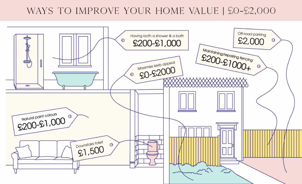 If the budget allows, paint your home in neutral colours for £200-£1k to give buyers a blank canvas. For the same cost, you can add a bath and a shower too.