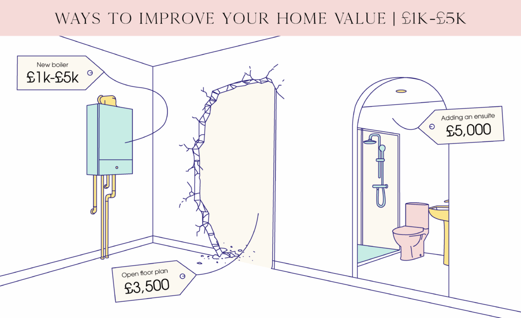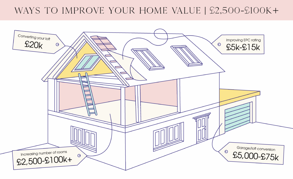 Larger budgets are ideal for structural improvements such as increasing the number of bathrooms and bedrooms, if possible, for £2.5k to £100k. Alternatively, convert your loft (£20k) or garage (£5k-£75k) to add more space.